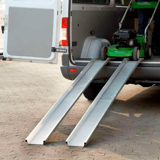 Die ABS Alurampen, die aus einem Strangpressprofil hergestellt werden, bieten ein ideales Verhältnis zwischen Eigengewicht und Belastbarkeit. Mit einer Innenbreite von 155 mm sind sie sehr gut geeignet um z.B. Motorräder, Hochdruckreiniger, Generatoren, Rollstühle usw. zu verladen. Durch die Formgebung können diese Schienen platzsparend ineinander gelegt wurde.